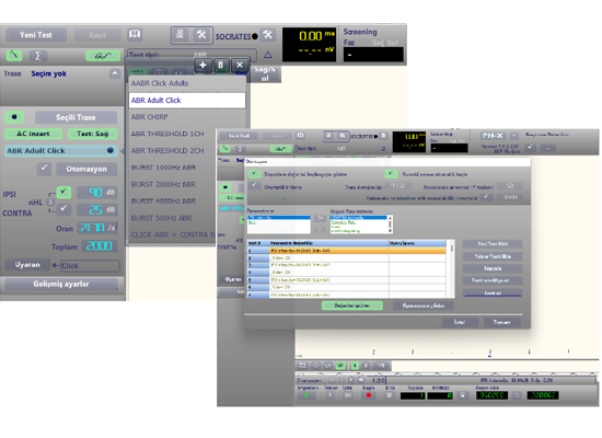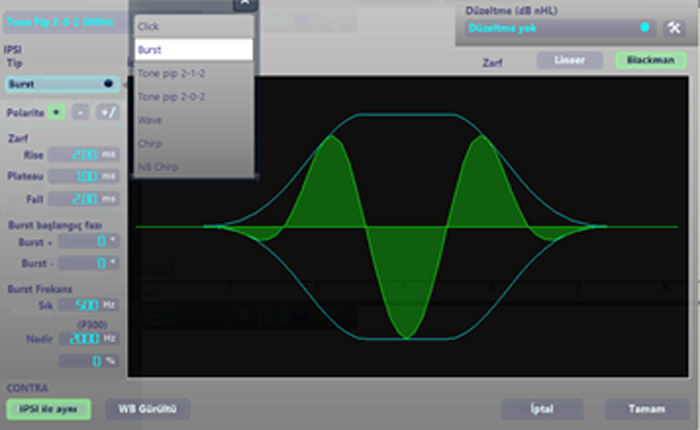 • Click, Tone Burst, Tone Pip, Chirp, NB Chirp, .wav ses dosyası, WBN uyaranları